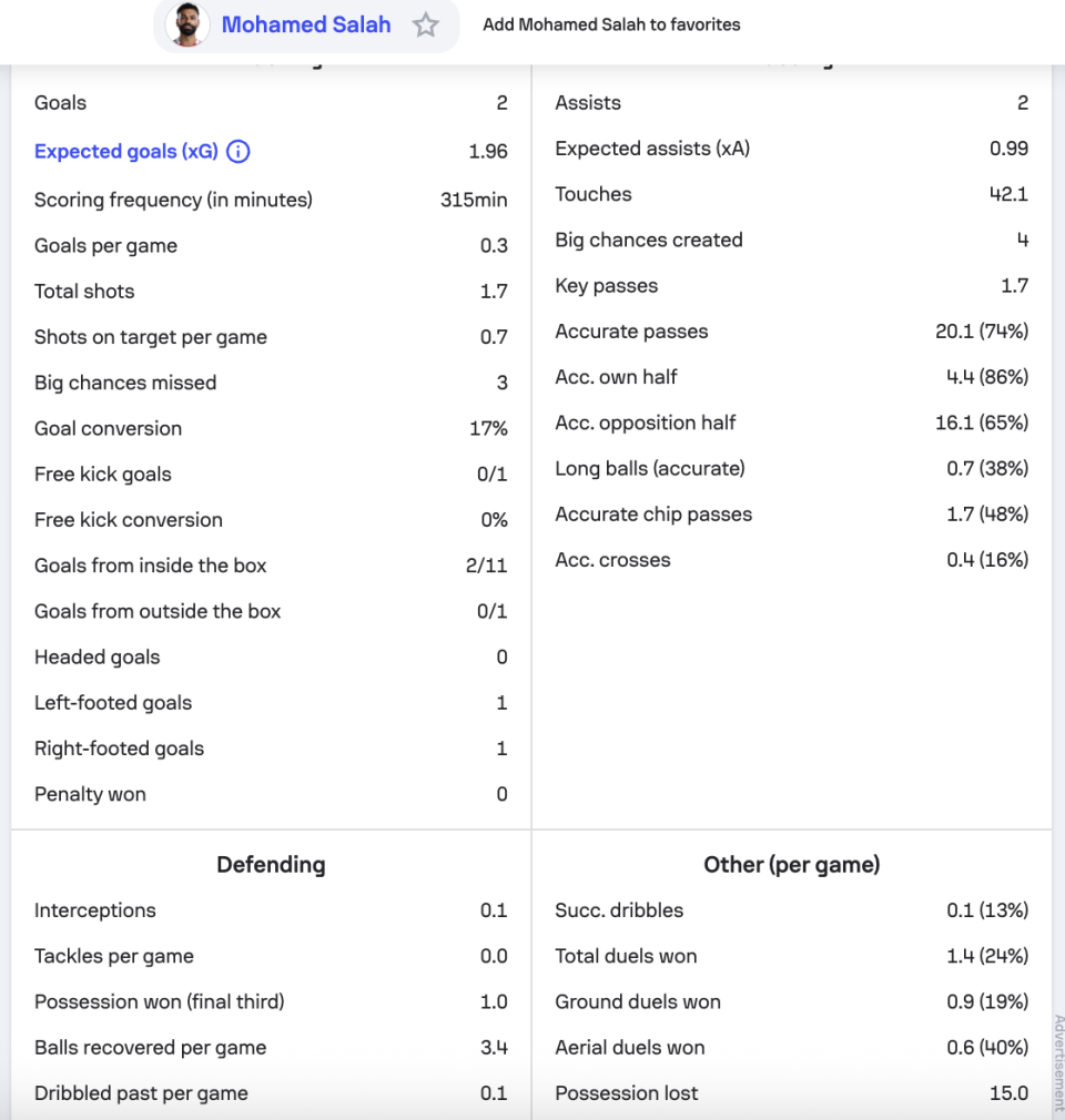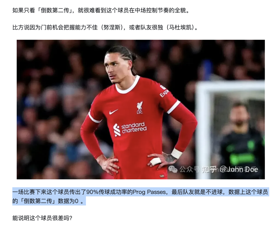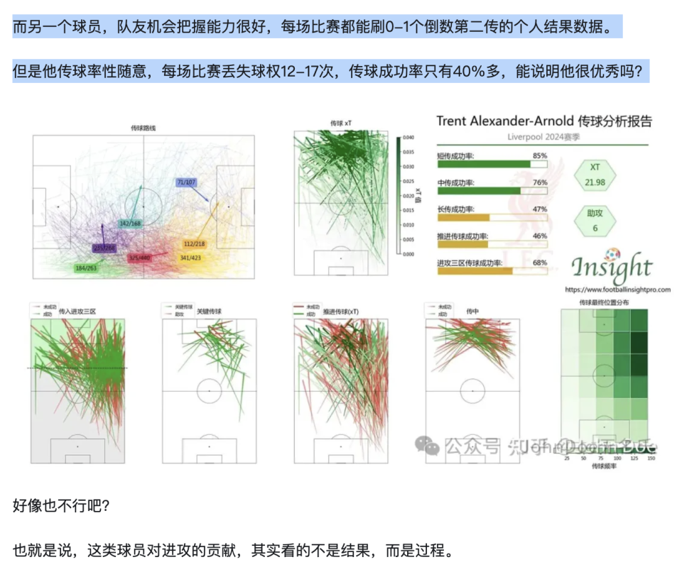 而以上的这些数据,在足球数据分析里面我们管它叫做「结果数据」。所谓的结果数据,就是只呈现结果,但是不展示过程的数据,这些数据往往通常都会被很多客观上的外部条件所影响,比方说球权占比,对手的防守情况,己方的支援情况等等。这里我想起了此前我文章中对某些球员的类比:如果足球的“倒数第二传”计入进攻数据,足坛会发生什么变化?